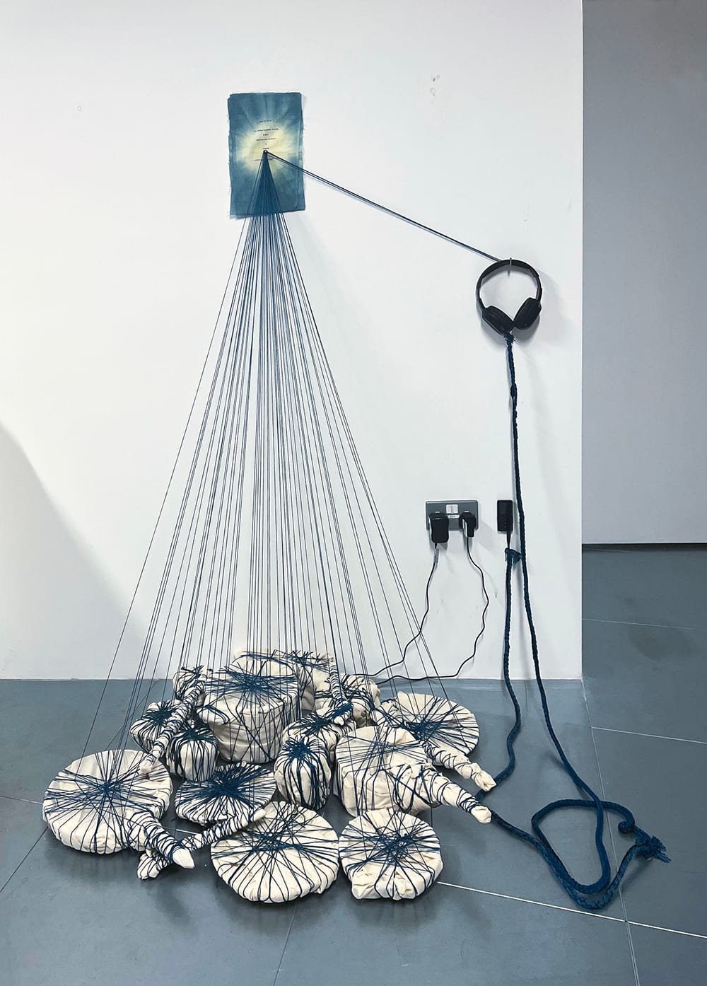 Tethered parcels bound in indigo yarn cluster toward a shared point. From this nexus, a single pair of headphones stretches out, echoing the installation’s quiet gravity. Indigo Darpan (indigo mirror) threads together colonial history, banned theatre, and speculative protest. Taking cues from Dinabandhu Mitra’s 19th-century play Nil Darpan, Shruti Gaonkar refracts the legacy of British indigo exploitation in India into something both intimate and unresolved. The installation unspools its story not through linear narration, but through texture and tether, suggestion and stillness. The soundscape, developed in collaboration with UK-based artist Joe Hirst, functions as a spatial ghost, polyvocal and architectural. Together, they conjure a protest not yet past, where myth and record, violence and care, remain entangled.